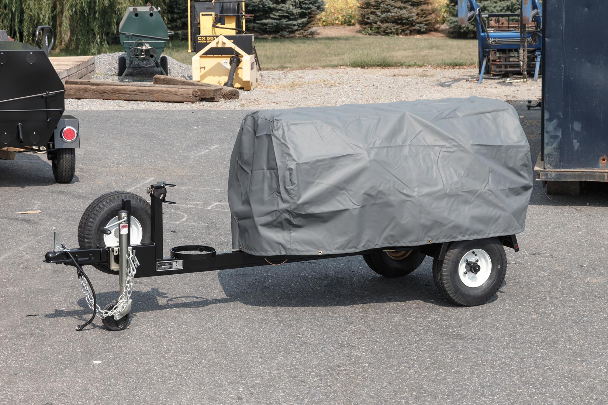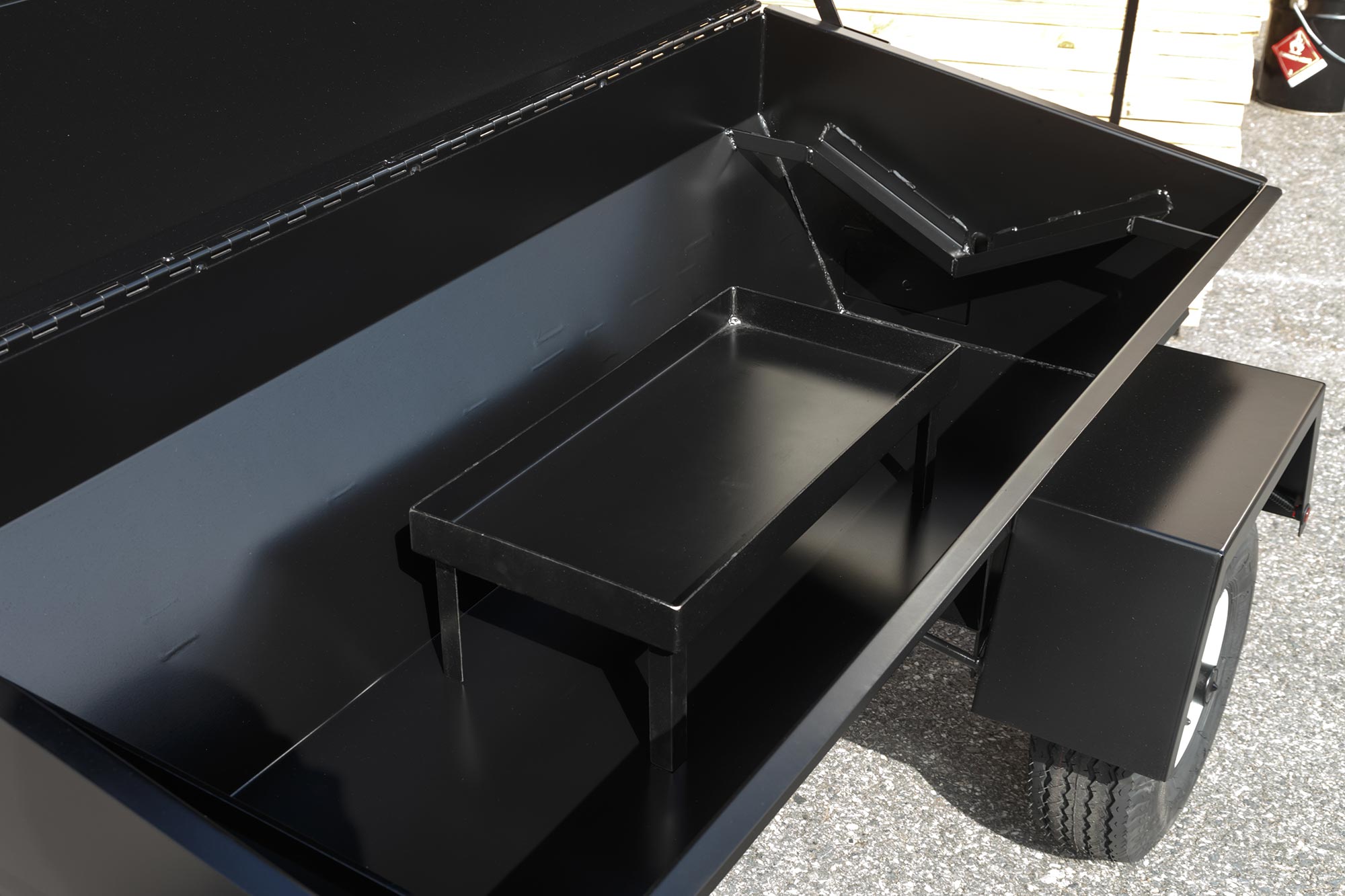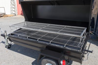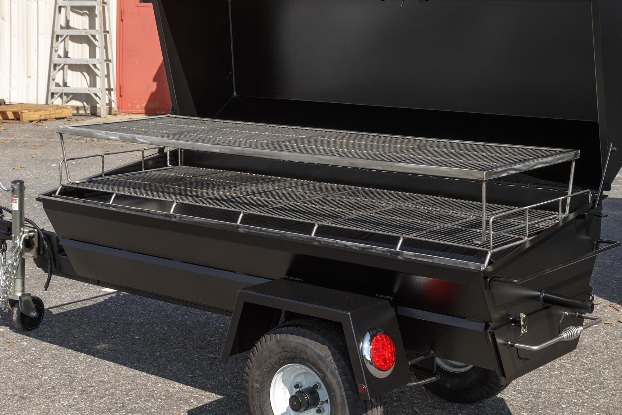Trailer has components welded to the bottom of the roaster and features a 2” ball hitch and safety chains, heavy-duty wheel jack, rubber torsion axle, road-worthy tires, and DOT-compliant flush-mount LED lights, reflector strips, and VIN plate.