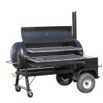 This smoker comes standard with “extras” such as food grade stainless steel grates and a slide-out ash pan. This innovative ash pan makes clean-up quick and easy and helps you get more heat out of the same amount of fuel since the ashes can fall away from the fire. 18″ tires and locking casters make it easy to move the smoker on hard surfaces and lock it into place.