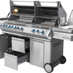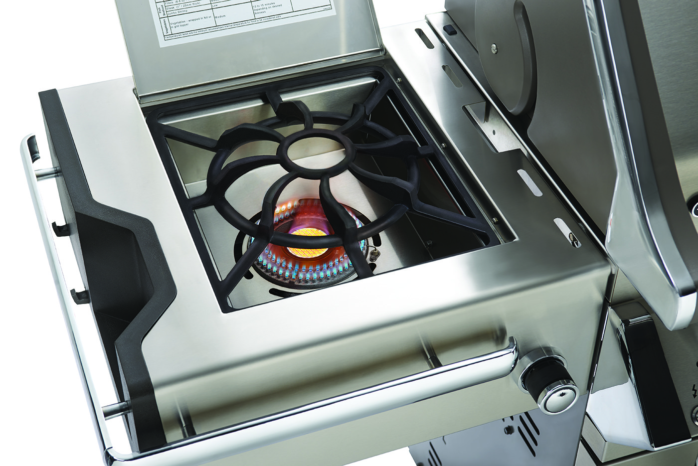 Napoleon’s Prestige PRO™ 825 with Power Side Burner and Infrared Rear and Bottom Burners proves that two heads are better than one. On the outside, shining stainless steel body provides durability against the elements while chrome details add luxury. Our blue NIGHT LIGHT™ control knobs featuring SafetyGlow turns knobs red when gas is on. Know which burners are lit so you can get the perfect sear or the ideal indirect grilling spots. You’ll know it’s a Napoleon with the iconic WAVE™ cooking grids for those distinctive sear marks. The main grill head is big enough to grill for a crowd and provides loads of propane powered cooking, including turning your grill into a smoker with the integrated smoker tube and dedicated burner. The second head features two ceramic infrared burners that reach high heat in seconds, ideal for searing restaurant quality steaks. The Prestige PRO™825 has a two-stage power side burner with a reversible cooking grid, ideal for sauces, sautés, and side dishes.