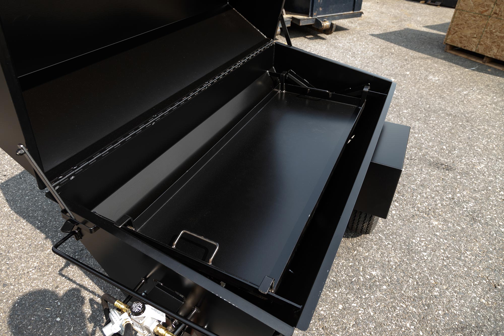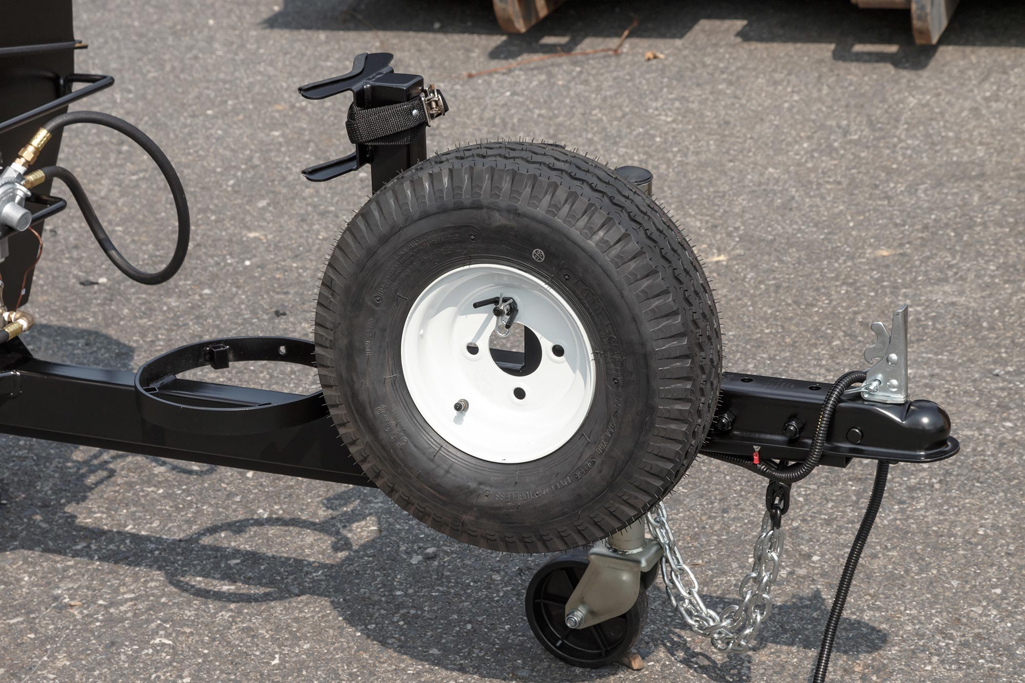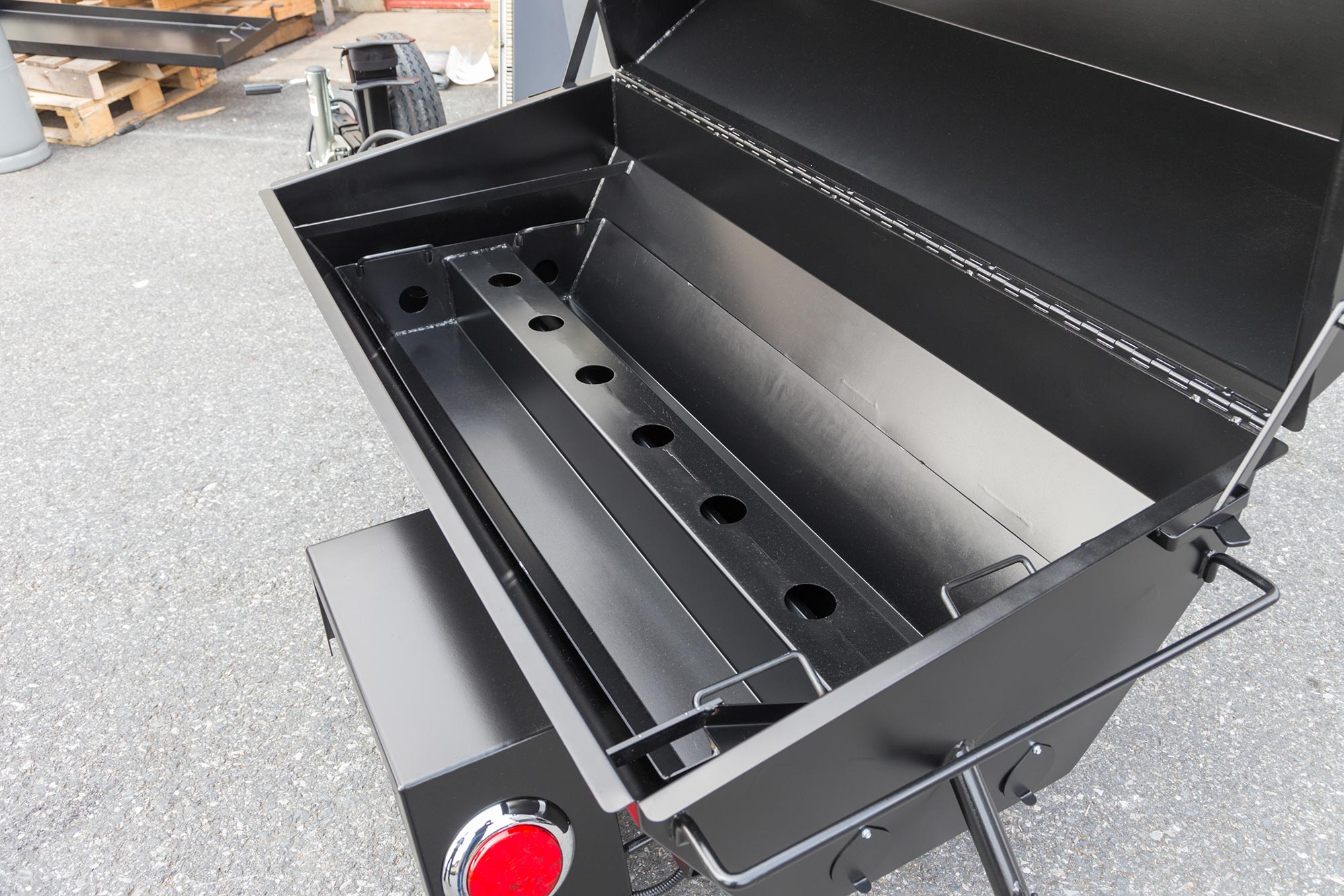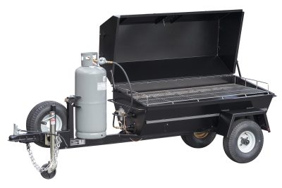- Trailer has components welded to the bottom of the roaster and features a 2” ball hitch and safety chains, heavy-duty wheel jack, rubber torsion axle, road-worthy tires, and DOT-compliant flush-mount LED lights, reflector strips, and VIN plate.