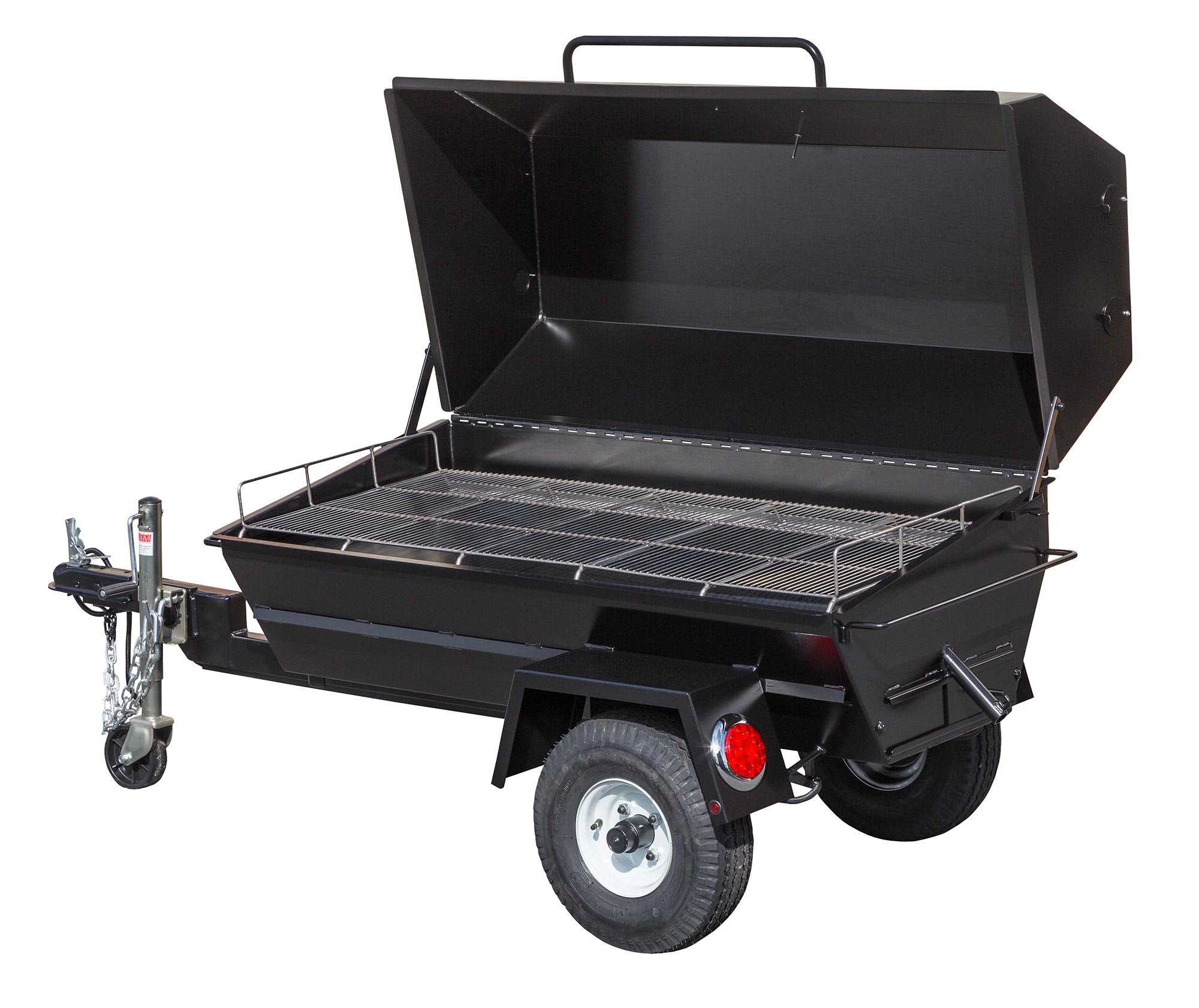 Trailer has components welded to the bottom of the roaster and features a 2” ball hitch and safety chains, heavy-duty wheel jack, rubber torsion axle, road-worthy tires, and DOT-compliant flush-mount LED lights, reflector strips, and VIN plate.