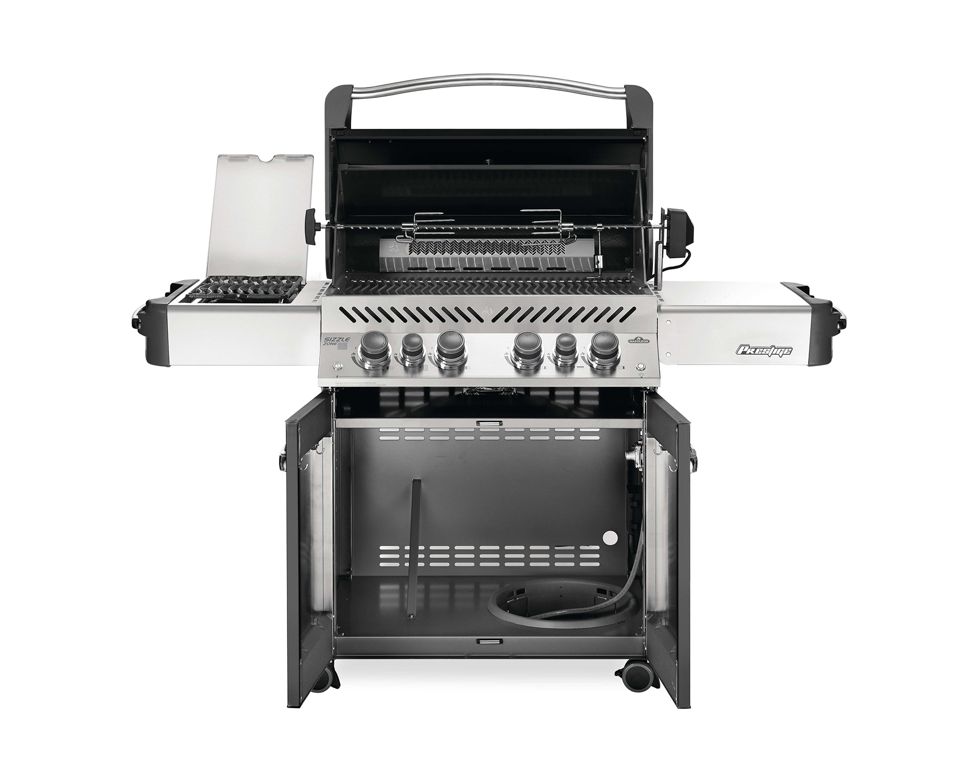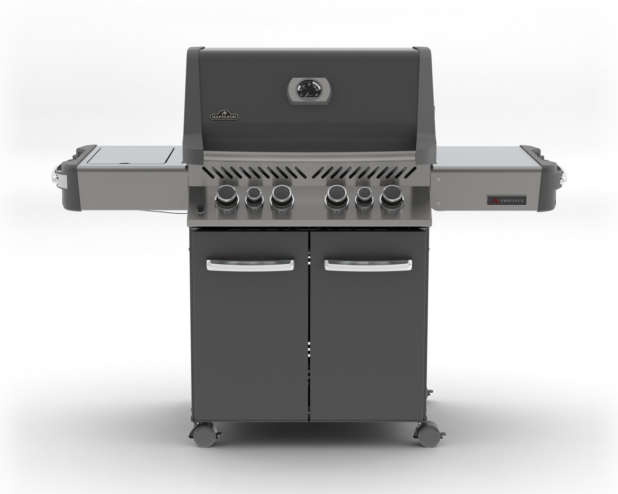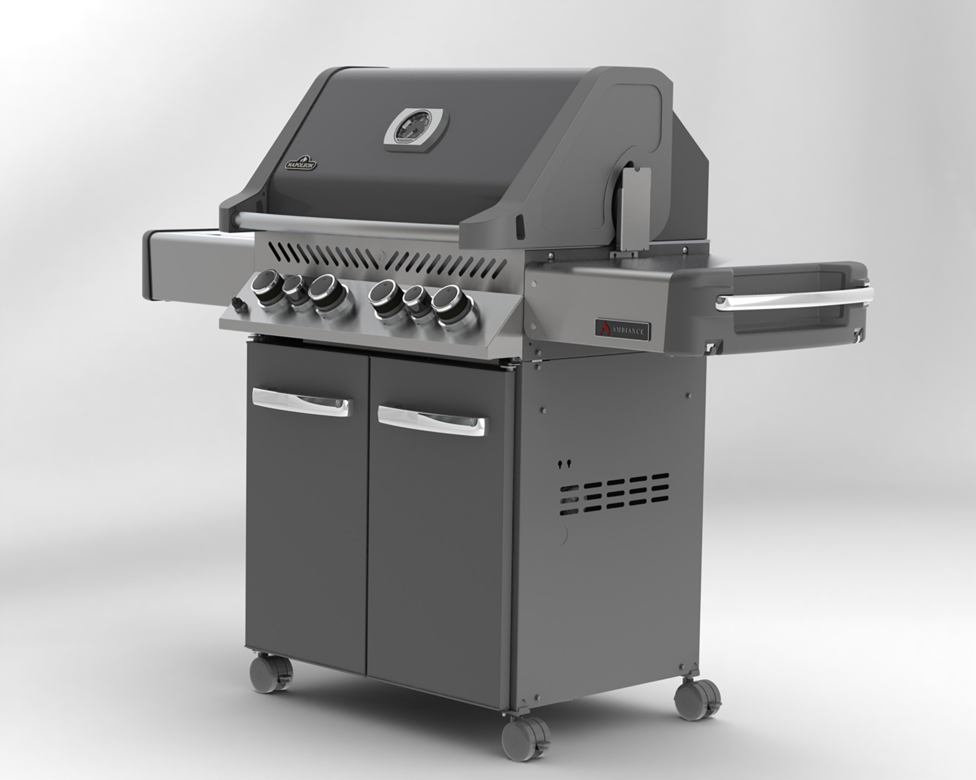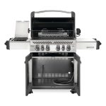 The Ambiance® 500 Grill by Napoleon is the best combination there is! This beautiful charcoal enameled grill provides the perfect tools to do the rotisserie, searing, grilling, baking and smoking! Heavy stainless steel grates are easy to clean and provide the searing marks restaurants are famous for! The lid hinges in the center which means that, when the lid is open, only half the grill is exposed and much less heat is lost.