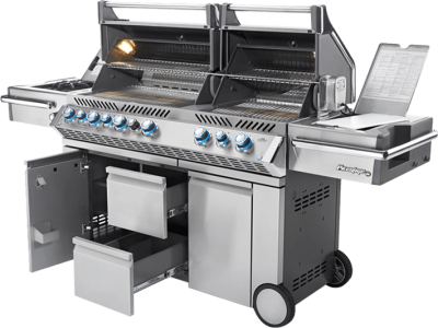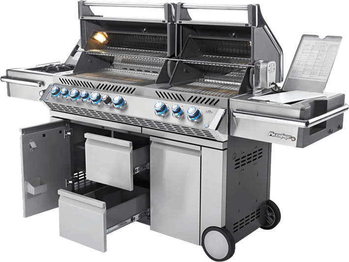 Napoleon’s Prestige PRO™ 825 with Power Side Burner and Infrared Rear and Bottom Burners proves that two heads are better than one. On the outside, shining stainless steel body provides durability against the elements while chrome details add luxury. Our blue NIGHT LIGHT™ control knobs featuring SafetyGlow turns knobs red when gas is on. Know which burners are lit so you can get the perfect sear or the ideal indirect grilling spots. You’ll know it’s a Napoleon with the iconic WAVE™ cooking grids for those distinctive sear marks. The main grill head is big enough to grill for a crowd and provides loads of propane powered cooking, including turning your grill into a smoker with the integrated smoker tube and dedicated burner. The second head features two ceramic infrared burners that reach high heat in seconds, ideal for searing restaurant quality steaks. The Prestige PRO™825 has a two-stage power side burner with a reversible cooking grid, ideal for sauces, sautés, and side dishes.