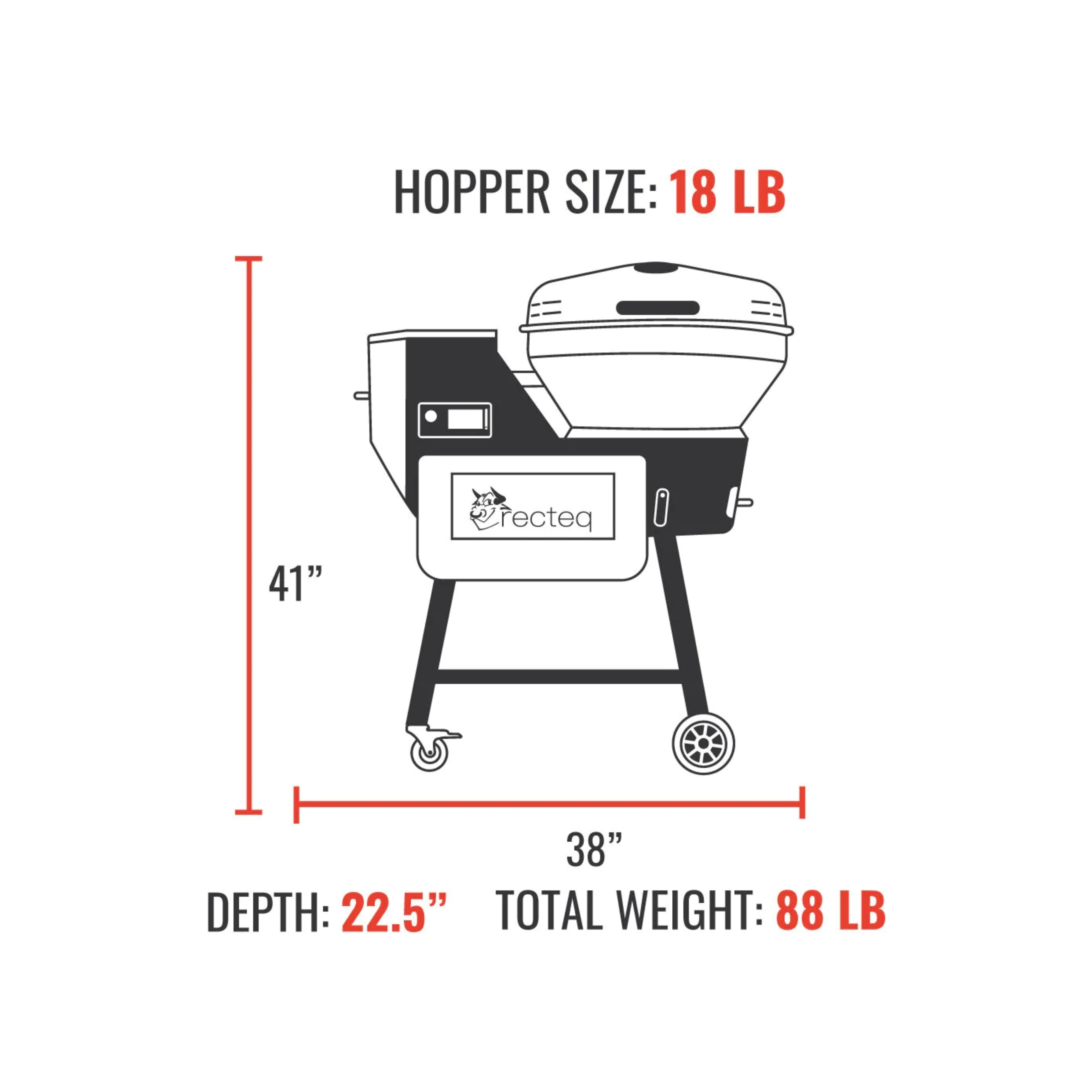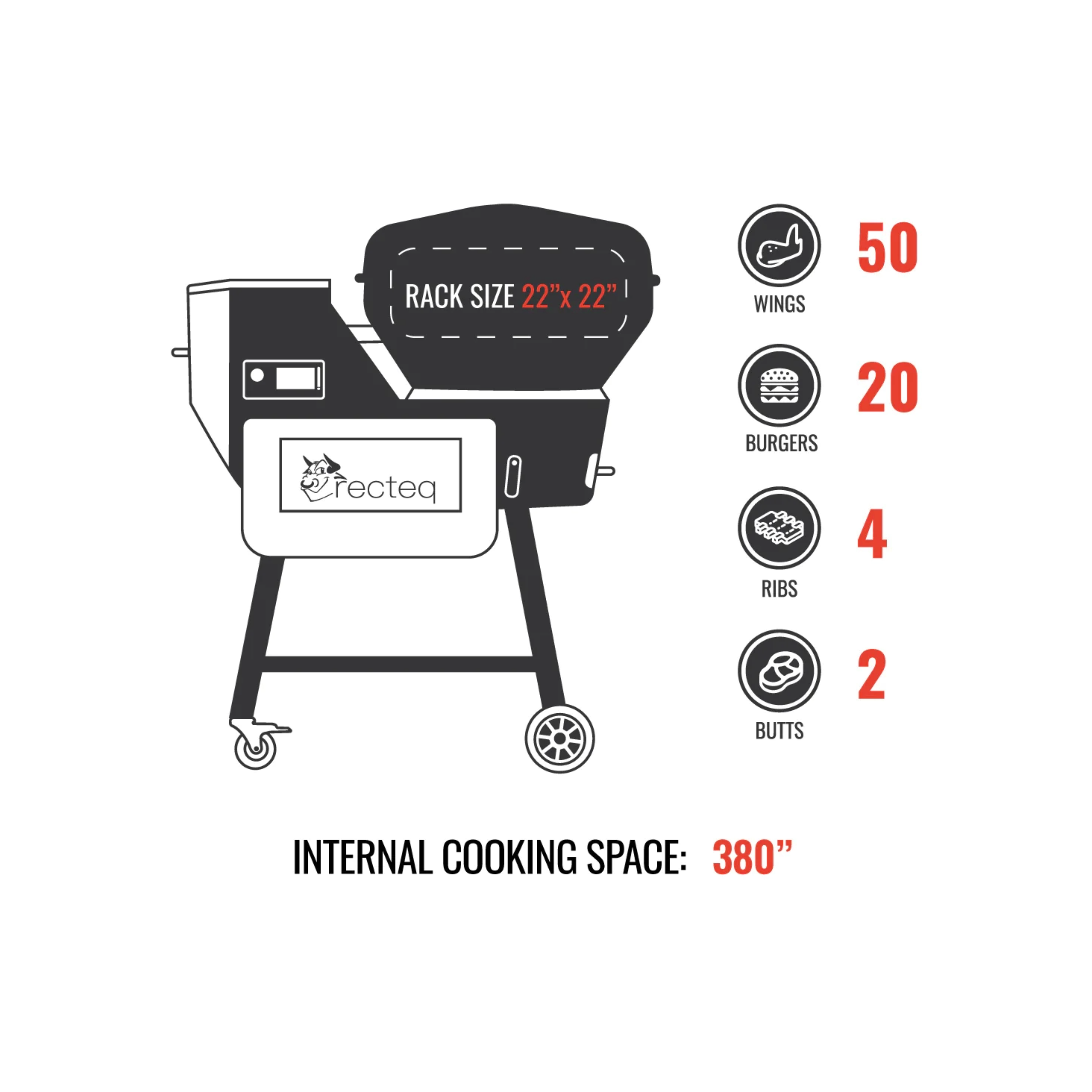 Recteq’s latest grilling breakthrough, the RT-B380X Bullseye Deluxe, elevates their weekday workhorse to a weekday warrior! With all-new smart grill functionalities including dual-band WiFi connectivity, PID control, and exceptional temperature capabilities! Featuring a sleek integrated front-folding shelf, a single probe port, and an 18lb. hopper, this design prioritizes convenience. Enhanced features such as the bottom shelf, integrated ash dump, and expanded hopper capacity ensure effortless maintenance. Plus, with a revolutionary afterburner firepot, achieving temperatures up to 1000°F for unparalleled searing prowess is now within reach!